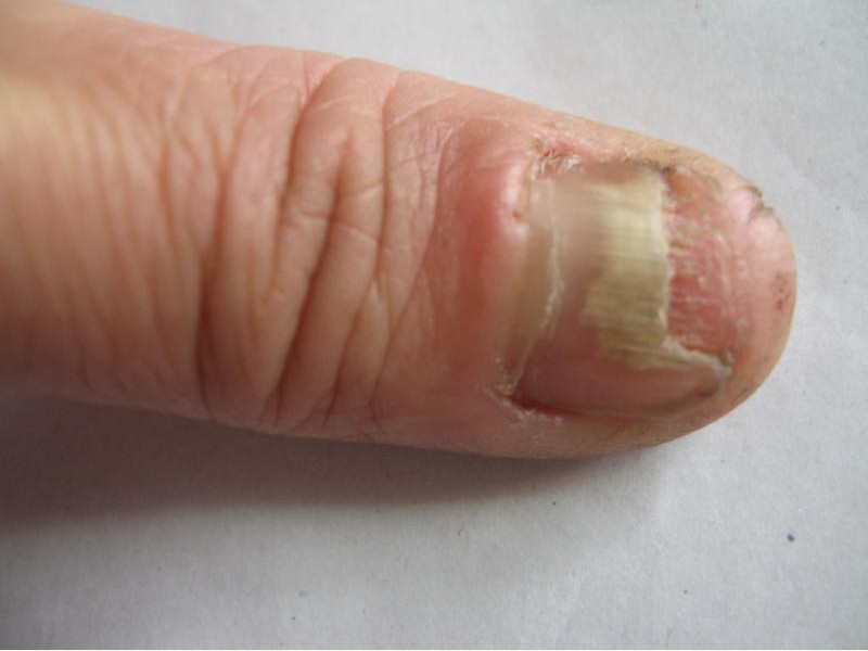 5、甲分层:增厚的角质物变干,变碎屑,变脆,它容易从甲板与甲床之间脱落下来,使得原本与指肉粘合的指甲表层,出现中空现象,即指甲分为2层,表层与指肉分离,另外分离出一层薄薄的甲 质粘在指肉上。