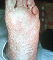 (3)鳞屑角化型:症状是足底、足缘、足跟部皮肤脚趾增厚、粗糙、脱屑,鳞屑成片状或小点状,反复脱落。冬季趾缝间皮肤发生裂隙,夏季产生水疱,有痛感。常因搔抓引起继发性感染,并发脓包疮、淋巴管炎、淋巴结炎、蜂窝组织炎、丹毒、败血症等疾患。