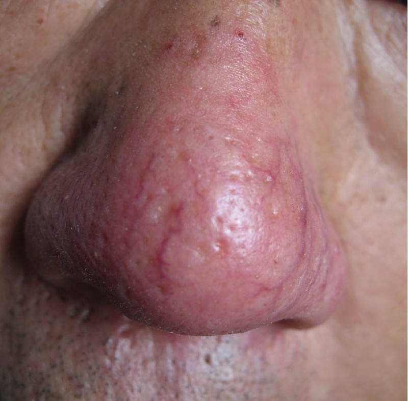 酒糟鼻是发于鼻部的一种慢性炎症皮肤病,多发生在中年人。男性严重程度要高于女性,酒渣鼻通常症状表现为外鼻皮肤发红,但以鼻尖最为显著。这是由于血管明显扩张的结果,鼻子显得又红又亮。