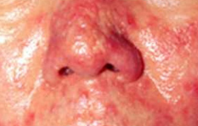 酒糟鼻症状轻重不一,初起为红斑、油腻。长时间不退,出现痤疮样反疹、脓疱,可伴少许渗出,上结黄痂,或生脓疱,鼻端可有绿豆大小的结节。酒糟鼻多见于中年人,女性多于男性,但男性患者病情较重,皮损好发于面部中央,对称分布。常见于鼻部,两颊,眉间,颏部。按其发展过程分为三期: