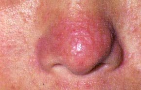 酒糟鼻的红斑经常出现在鼻尖部位,红斑跟周围的皮肤境界不清楚,但是随着病情发展,鼻子部位会发红而且持久不退,出现树枝状的血管扩张,鼻尖的部位也能够见到小丘疹以及小脓疤疹,严重时鼻尖的部位可以见到细小、大小不一的结节状突起,所以在这一时期我们称之为酒糟鼻的鼻赘期。酒糟鼻除了会对我们的外观产生影响之外,对于我们的健康不会有太大的影响,如果合并感染的话,会出现疼痛感,但是其他症状并不明显。