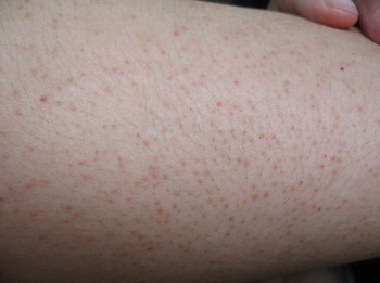 毛周角化患者比较多的会发生在上臂、颈部,有时整个的背部都是,从而造成皮肤的颜色比较深,同时也比较粗糙,虽然其颗粒状不是太明显,但是也是属于鸡皮肤。