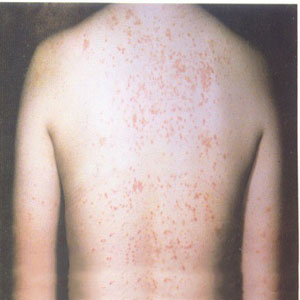 表现症状:全身都是,四肢,前胸后背,头上,都是牛皮癣,红色丘疹上是一层层的银白色鳞屑,皮损区干燥瘙痒,一抓就掉白花花的鳞屑很恐怖。
