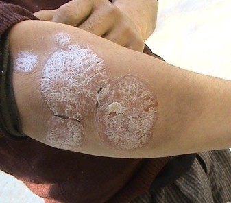 二、发展中。此病发展过程中,皮损形态可表现为多种形式。急性期皮损多呈点滴状,鲜红色,瘙痒较著。静止期皮损常为斑块状或地图状等。消退朔皮损常呈环状、半环状。少数皮疹上的鳞屑较厚,有时堆积如壳蛎状。皮损可在身体任何部位对称性发生。好发于肘、膝关节伸侧和头部。少数病人指(趾)甲和黏膜亦可被侵。