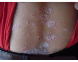 牛皮癣临床一般分为寻常型、脓疱型、关节病型与红皮病型四种类型。发病初期以寻常型多见,牛皮癣初期症状主要以丘疹、斑丘疹、鳞屑、薄膜、出血点为主要特征。初起皮损往往是红包或棕红色小点或斑丘疹,有干燥的鳞屑,以后逐渐扩展而成棕红色斑块,边界清楚,相邻的可以互相融合。