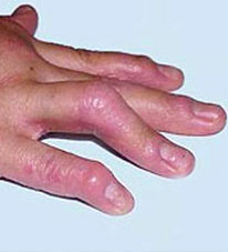 (1)单关节炎或少关节炎型占70%,以手、足远端或近端指(趾)间关节为主,膝、踝、髋、腕关节亦可受累,分布不对称,因伴发远端和近端指(趾)间关节滑膜炎和腱鞘炎,受损指(趾)可呈现典型的腊肠指(趾)指(趾)炎,常伴有指(趾)甲病变。约1/3—1/2此型患者可演变为多关节炎类型。