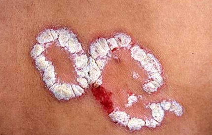 银屑病是一种常见的、原因不明的红斑、丘疹、慢性皮肤病。基本皮损为表面白色、基底潮红的斑丘疹,可融合成形态不同的斑片,如点滴状、钱币状、环状、地图状、蛎壳状等。但其上都有堆积较厚的银白色有闪光的鳞屑。鳞屑很易被乔除,下面露出淡红色半迤明的薄膜,再乔一下,即可看到呈筛状如露水珠样的出血,这是本病的重要特征。