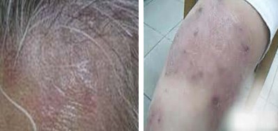 皮损可形成多种形态,如点滴状,钱币状,斑片状,地图状,环状,头部可呈帽盔状。少数皮损有渗出,干燥后形成污褐色鳞屑痂呈砺壳状,称为砺壳状银屑病,患者有不同程度的瘙痒。皮损以头皮、四肢伸侧,如膝前肘后好发,亦可泛发于全身各处。对称分布,少数病例皮损长期局限于某一部位,如,头皮、外阴或小腿等处,呈肥厚斑块状,称为慢性肥厚银屑病。发生于头皮者,皮损境界清楚,表面厚积鳞屑,头发呈束状,但无脱发和断发现象,皱裂部银屑病呈境界分明的炎性红斑,鳞屑较薄或缺如,常因摩擦、潮湿、多汗而致浸渍,皱裂或湿疹样变,掌跖部银屑病少见,为境界清楚的棕黄色角化斑,或点滴状角化过度,周围有红晕,斑上可有白色鳞屑或点状凹陷,易形成皱裂,口唇及龟头部银屑病,边界清楚的淡红色或者灰白色浸润斑,刮之可见白色鳞屑及点状出血。指(趾)甲银屑病多见,甲板常有"顶针样"凹陷,失去光泽,可出现纵脊,横裂、肥厚,甚至破坏脱落。