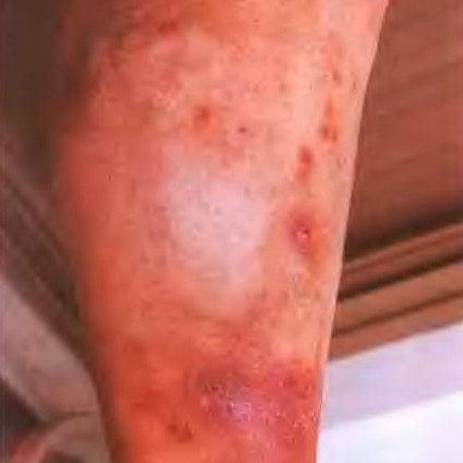 急性湿疹:自觉剧烈瘙痒,皮损多形性、红斑、丘疹、丘疱疹或水疱密集成片,易渗出,境界不清,周围散在小丘疹、丘疱疹,常伴糜烂、结痂,如继发感染,可出现脓包或浓痂。处理适当则炎症减轻,皮损可在数周后消退,但常反复发作并可转为亚急性或慢性湿疹。