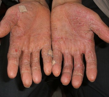 慢性湿疹:常因急性、亚急性湿疹反复发作不愈二转为慢性湿疹;亦可开始不明显,因经常搔抓、摩擦或其他刺激,以致发病开始时即为慢性湿疹。其表现为患处皮肤浸润肥厚,表面粗糙,呈暗红色或伴色素沉着,皮损多为局限性斑块,常见于手足、小腿、肘窝、乳房、外阴、肛门等处,边缘清楚。病程慢性,可长达数月或数年,也可因刺激而急性发作。