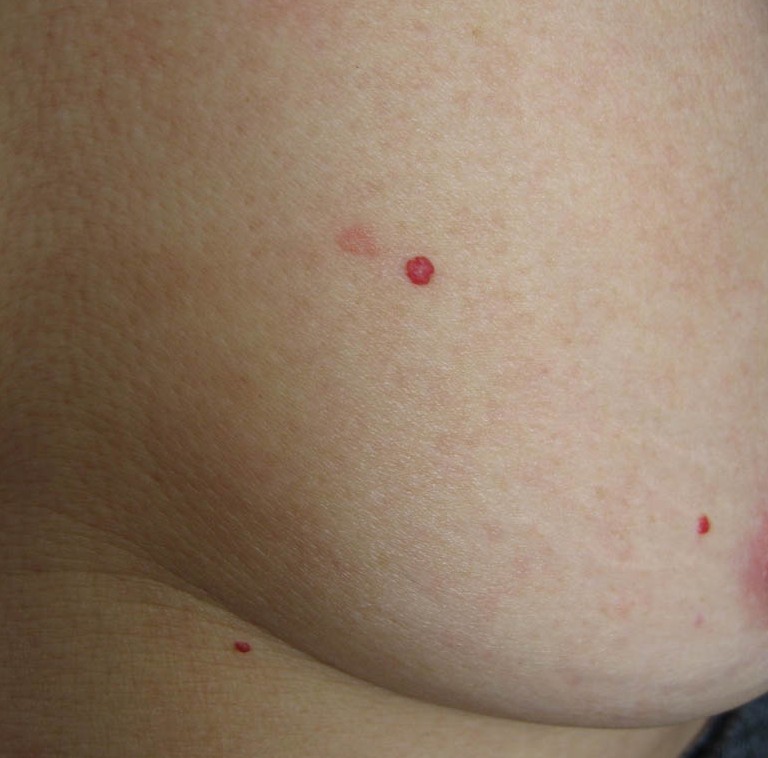 4)局部草莓状血管组织坏死引起周围血管充血,变大,形成了血泡。