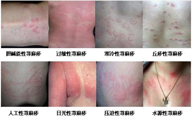 6、胆碱能性荨麻疹:因运动、摄入热的饮料或食物、出汗及情绪激动等因素诱发。表现为泛发全身的直径约1-3毫米的小风团,周围有明显红晕,有时可见到卫星状风团。皮疹持续1小时左右或更久。本病可反复发作数月或数年,但可自发性缓解。部分病人可合并腹痛、恶心、流涎、头痛、眩晕等全身症状。