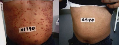 详细的检查后,主治专家确诊其为荨麻疹,之前的药物治疗导致了泛发全身。好在来的还算及时,主任采用了汉方共振生物止痒脱敏疗法。经过两个疗程的治疗,胡军身上的红疹明显消退,瘙痒症状也减轻了很多,然后主任又给胡军继续加了一个疗程巩固疗效,现在胡军已经彻底痊愈了,老婆也是紧紧挎着他的胳膊一同来医院道谢,宛如热恋中的小情侣。