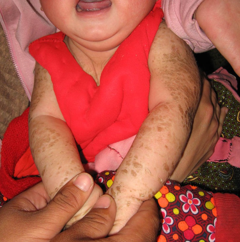 寻常型鱼鳞病对称好发于四肢伸侧及躯干,尤以肘膝伸侧为着。严重者可波及全身,伴有掌跖过度角化,鞍裂及指(趾)甲改变。通常无自觉症,冬季由于汗腺及皮脂腺分泌减少,皮肤干燥,自觉瘙痒不适,如有皲裂则感疼痛。常染色体显性遗传性寻常型鱼鳞病患者常有异位性体质,如枯草热及哮喘等。