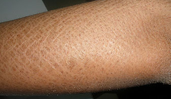 本型为常见的轻型鱼鳞病,亲代一方或双方患病则家中常有多人摧患,但无性别差异。常自幼年发病,随年龄增长而加剧,至青春期症状最为显著,以后即停止发展。皮损表现轻重不一,轻者仅冬季皮肤干燥,无明显鳞屑,搔抓后有粉状落屑,称为干皮症。或于毛囊口见有针尖大小与毛囊与致的褐色或淡褐色鳞屑,无自觉症,称为毛囊性鱼鳞病(ichthyos;sfoll;cularis)。