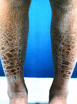 2、性连寻常型鱼鳞病,皮损可累及全身。男性发病,女性为携带者。